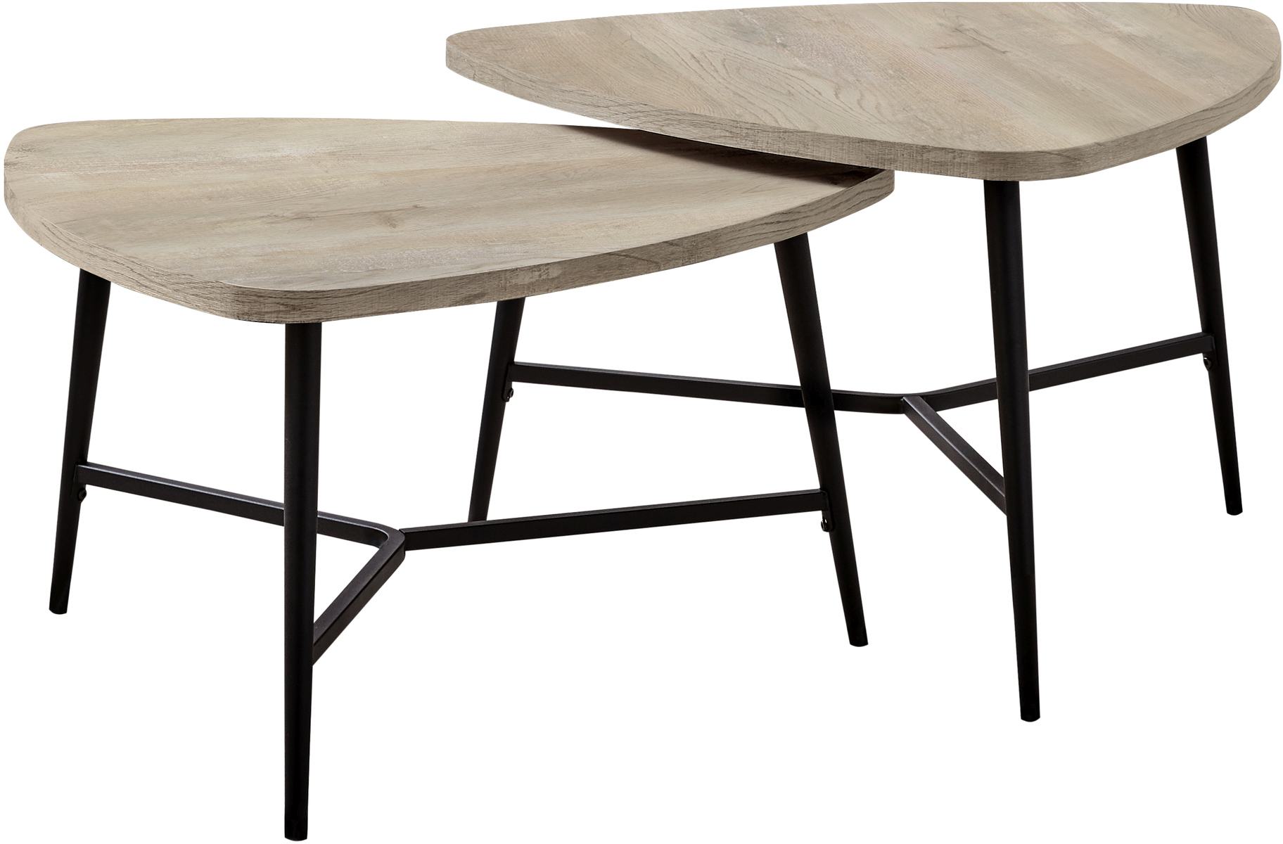 Give an easy upgrade to a room with this set of 2 chic nesting coffee tables in a mid-century inspired design. The triangle shaped tops have a smooth taupe reclaimed wood look laminate finish, contrasting with tapered, black metal tripod shaped legs for a contemporary industrial style. Both tables have the same surface size at different heights, designed to neatly stack one under the other as a practical space saving solution or for a creative effect. Move them around when you need extra space for entertaining or keep them nested neatly in place. This table set adds style whether it is placed in a formal living room, family room, or office space. Assembly is required.