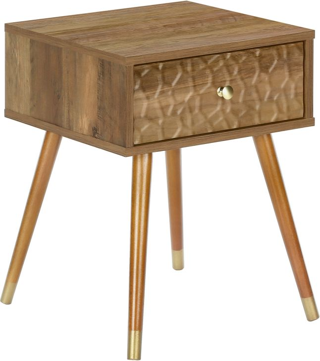 Exquisite styling and exceptional functionality make this accent table with storage a standout piece for a living room or bedroom. A distinctive, rippled pattern on the drawer front delivers a captivating visual effect and adds an unexpected element of texture. Gold drawer knobs and detailing on the legs bring a subtle touch of glam. Solid wood legs, which are round and have a tapered shape, mix sturdy construction with chic design. Finished in a walnut wood-look laminate with realistic colour variations, this mid-century modern end table features a square tabletop to display a lamp or small items and 1 storage drawer. With its versatile design, it can serve as a side table or nightstand.