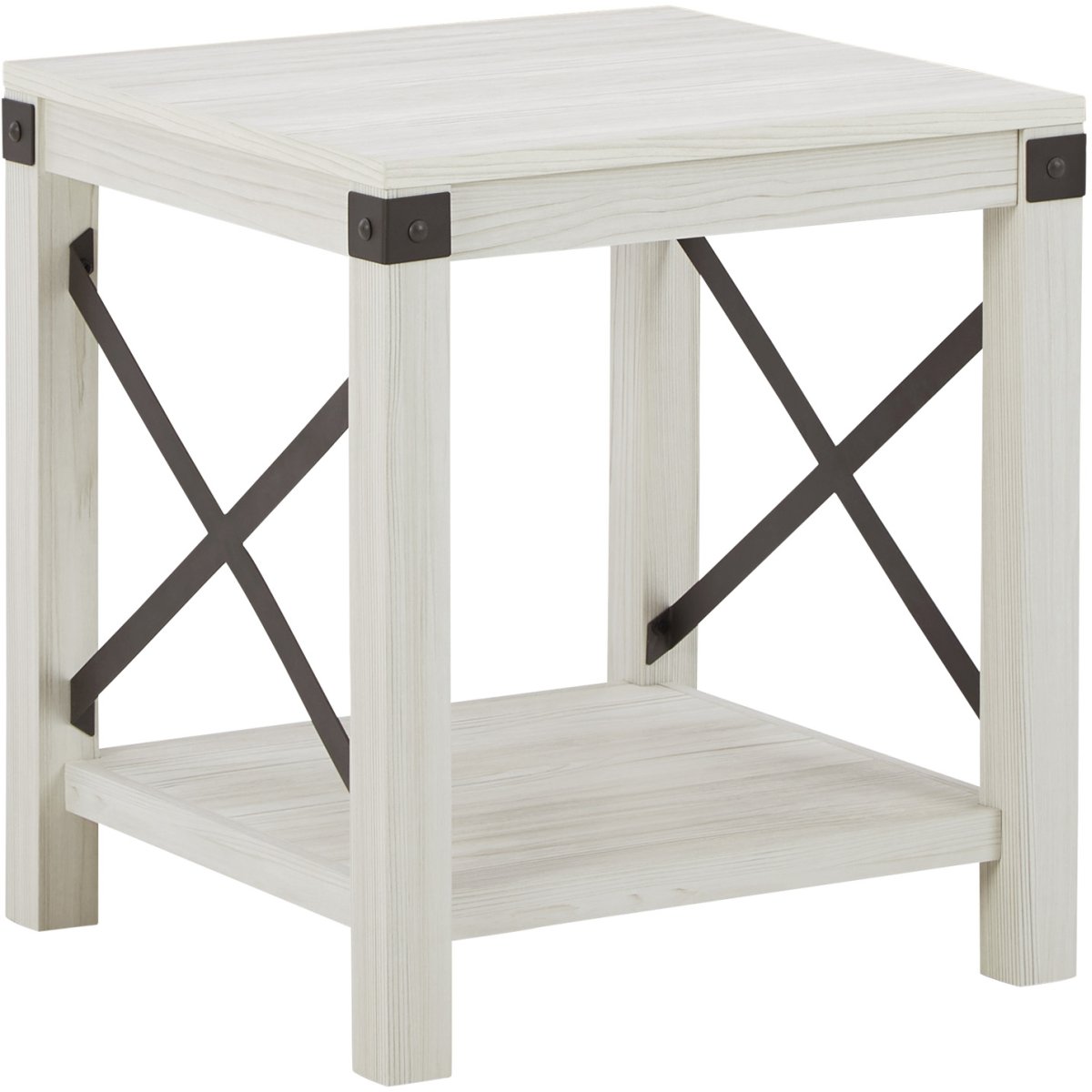 Modern Farmhouse design. Made with engineered wood substrate and decorative laminate. Replicated vintage barn wood with a whitewashed color tone. Metal cross-buck frames and lower shelf for extra display space.Read More