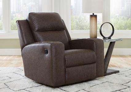 Indulge your lust for comfort and love for contemporary design with this rocker recliner. Made for easy everyday living, it’s upholstered in a heavyweight padded faux leather and accented with contrast jumbo stitching for fashion-forward flair. Sleek track arms elevate the look with a touch of modern sensibility.Read More