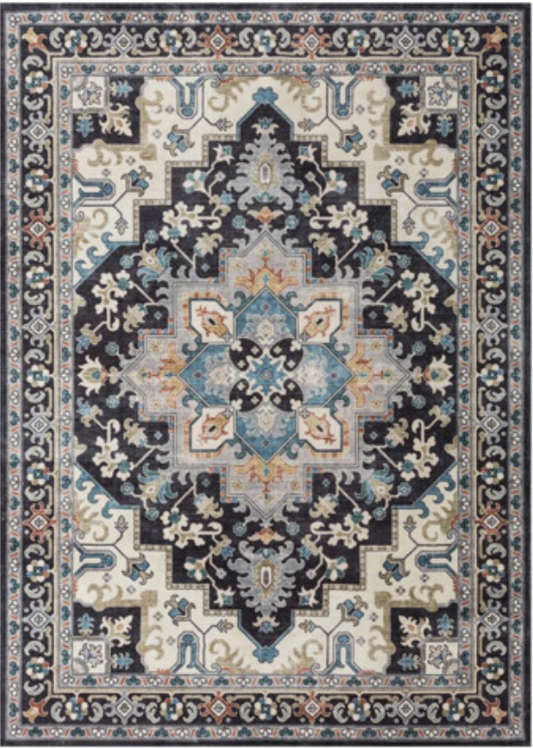 Machine woven, printed medallion design in shades of black, cream, blue, teal, gray, rust and ocher