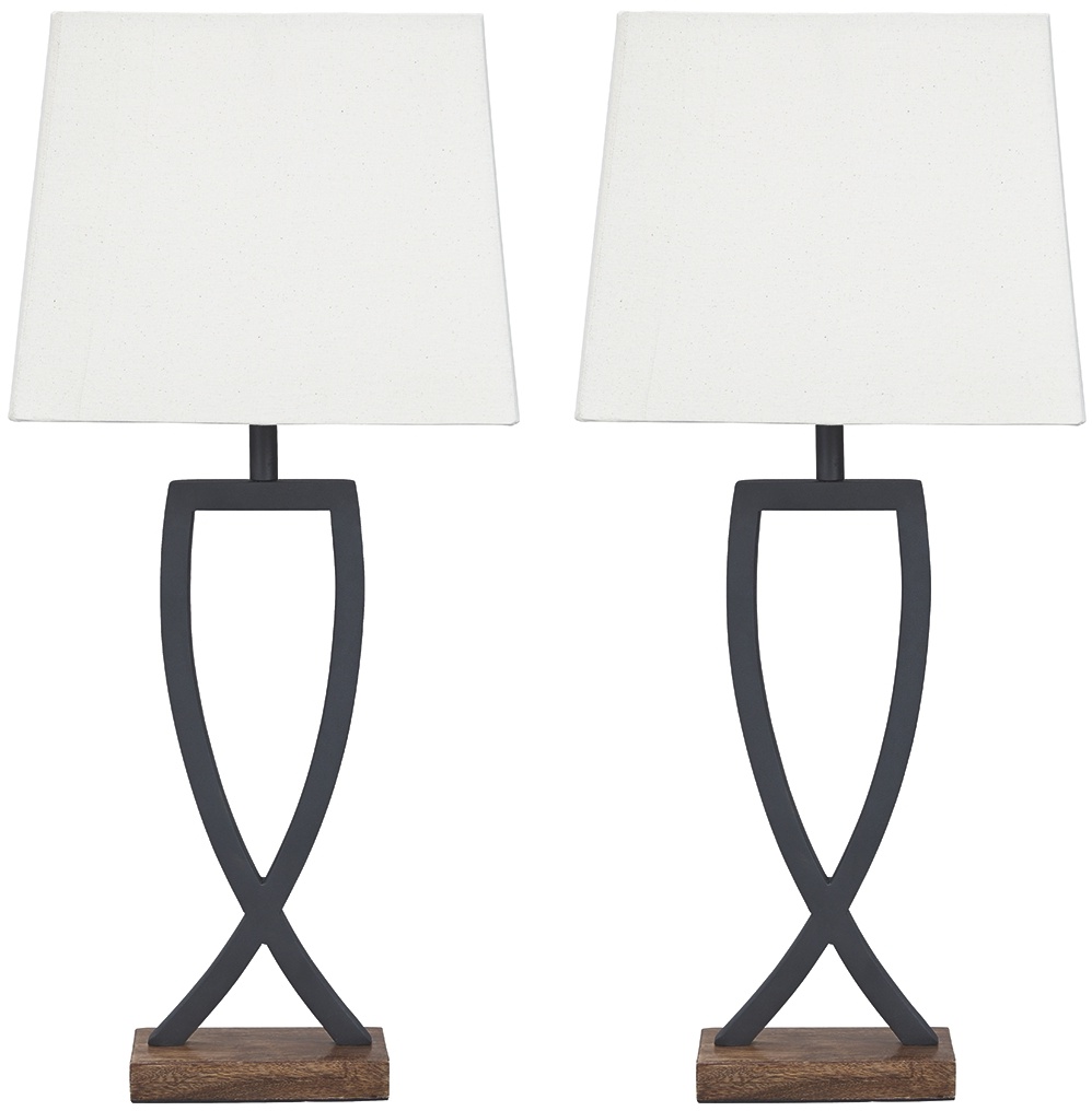 The Makara 2-piece table lamp set features and open design, crisscrossed lines, and rectangular hardback shades for a streamlined look.