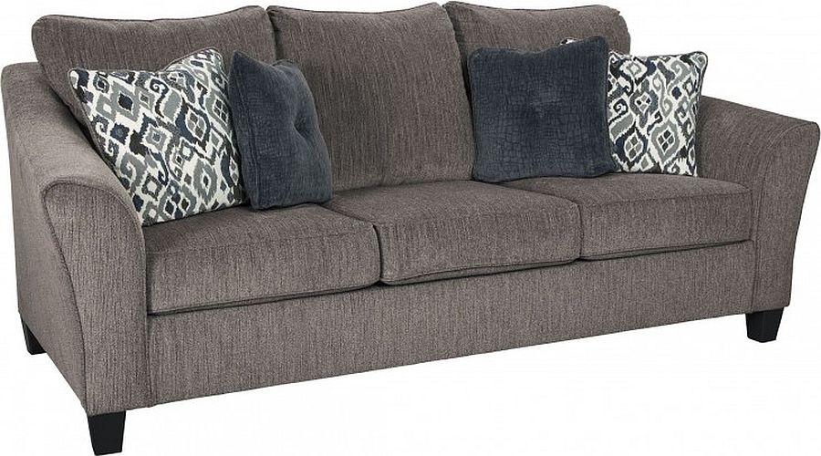 The Nemoli slate-coloured sofa features loose cushions, unattached backs, 2 patterned accent pillows, and 2 button tufted pillows for a rounded out look.
