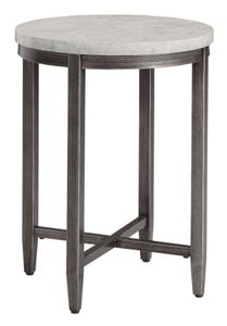 With its casual, linear style design, this round end table is a sleek, chic accompaniment to your sofa or sectional seating area. Features faux concrete melamine top with metal base in a dark pewter-tone finish.