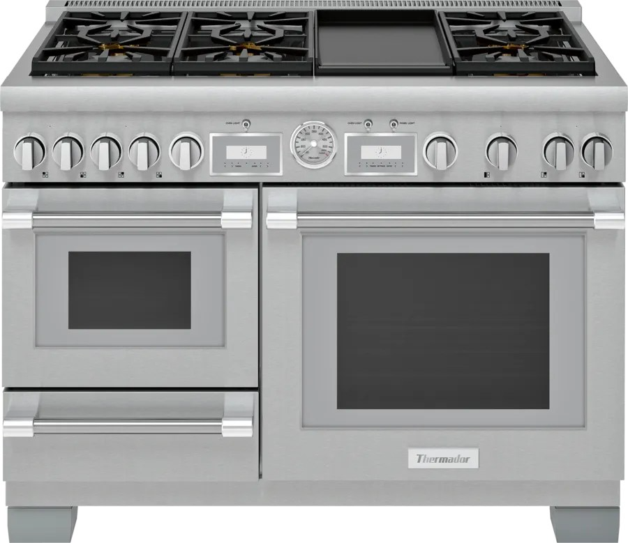 48" Professional Dual-Fuel Cabinet depth (24") Range - All Telescopic Oven Racks- Thermador Connected Experience with Home Connect™ - Six Pedestal Star® Burners (Two with ExtraLow®) - Non-stick surface Electric Griddle - 5.7 cu. ft. main oven cavityRead More