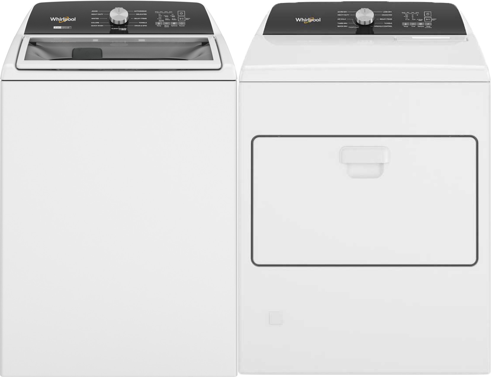 Whirlpool® White Laundry Pair with a 5.5 cu. ft. capacity top load washer and a 7.0 cu. ft. capacity front load gas dryer.Read More